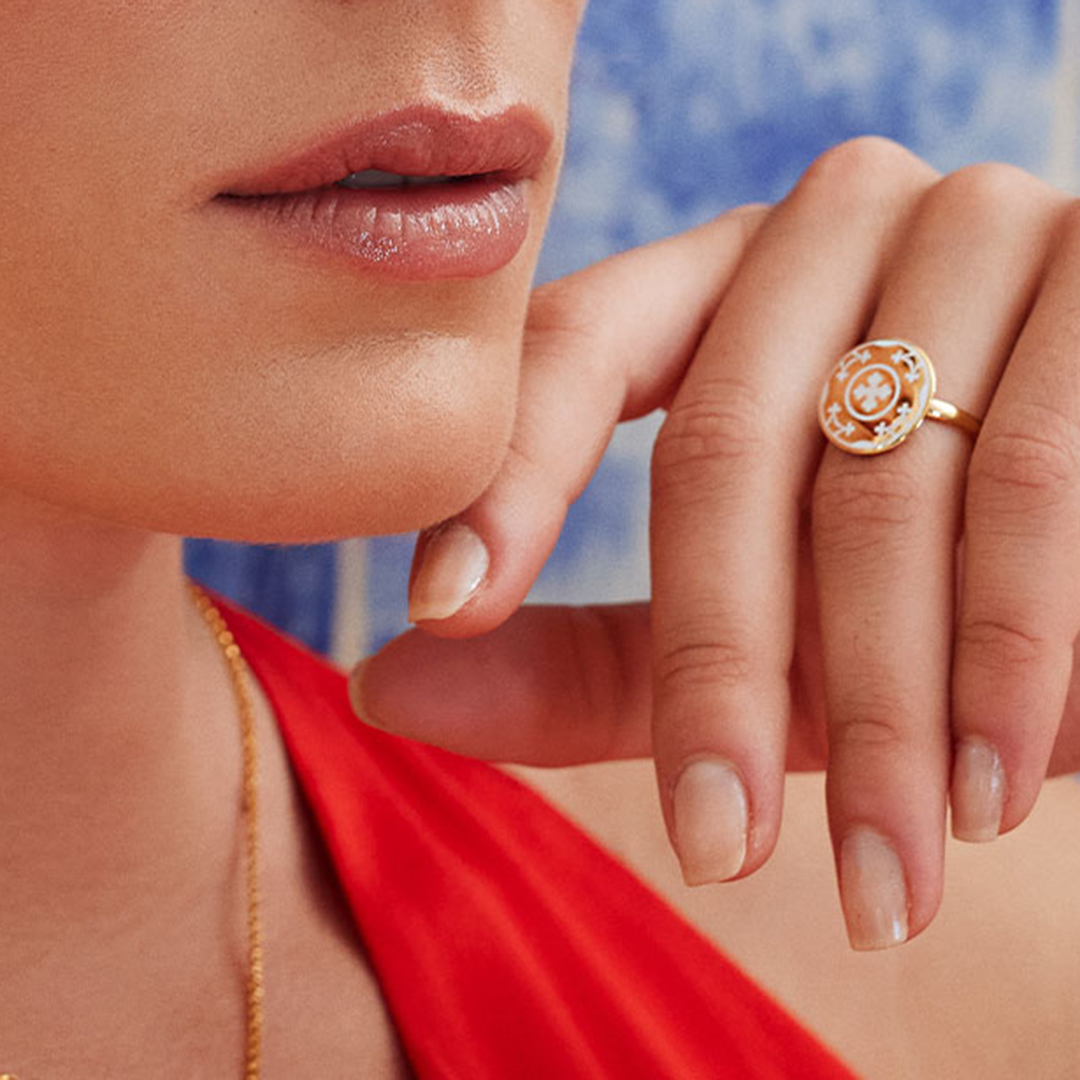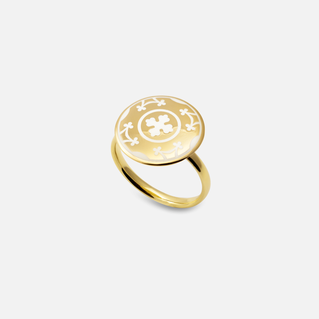 The Costa do Castelo ring features a delicate yellow gold band decorated with a white ceramic enamel accent, with the iconic illustration of a traditional Portuguese tile.