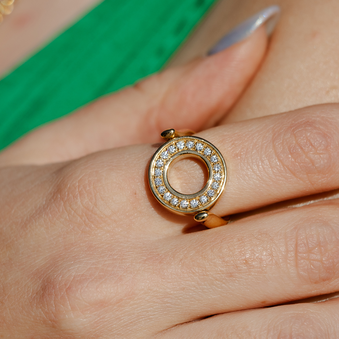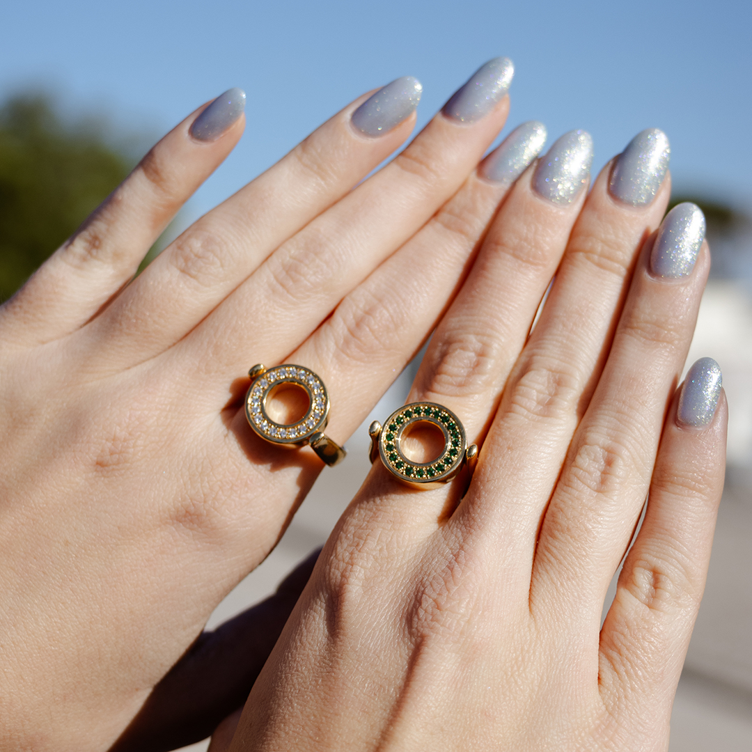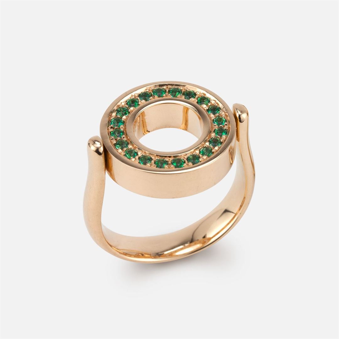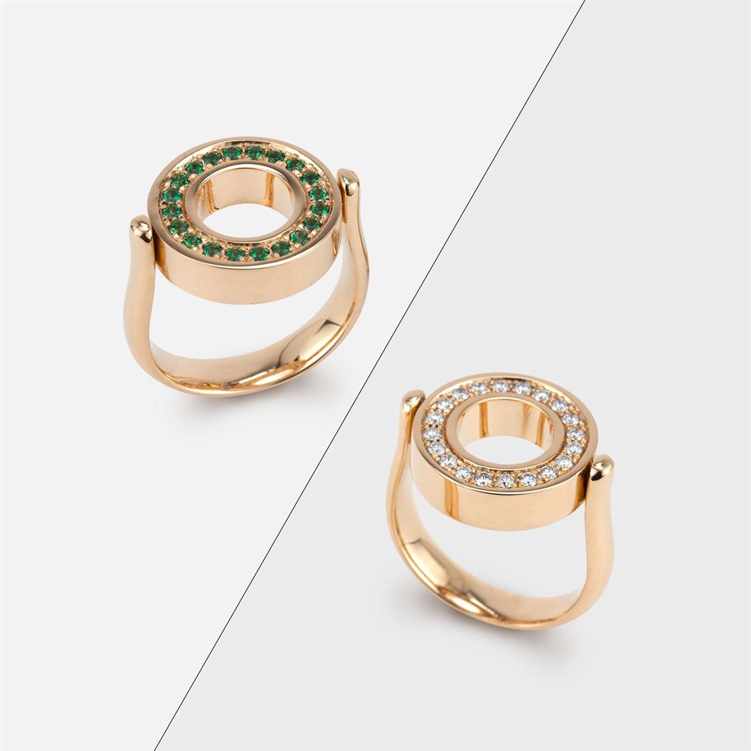 Set with diamonds and green topazes, the ring from the inverso collection is a reversible piece that adapts to any moment and occasion.
