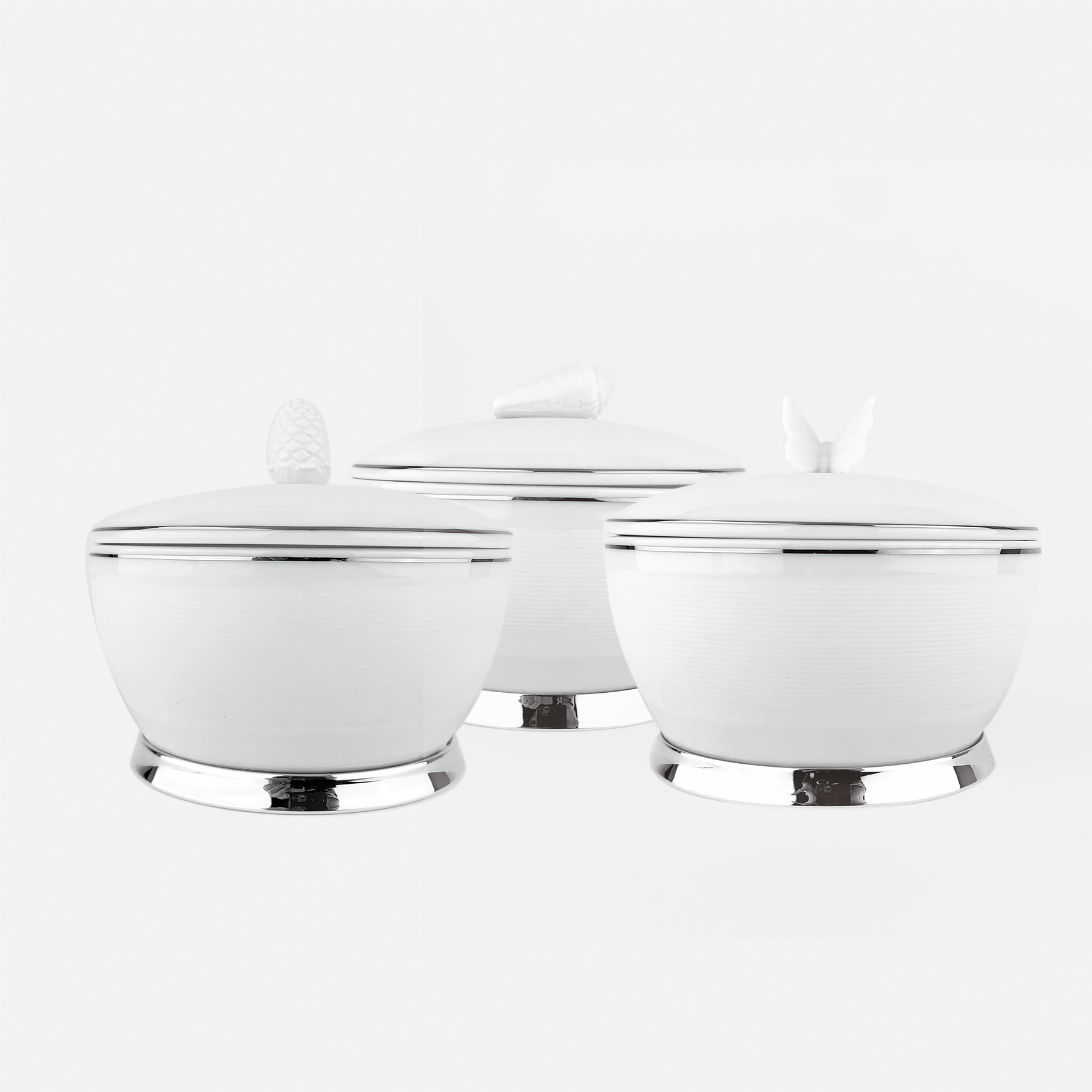 The Striped Porcelain and Silver Box with Pinecone Lid is a piece that combines the delicacy of porcelain with the sophistication of silver. Add a touch of elegance to your space with the softness and delicacy of biscuit porcelain.
