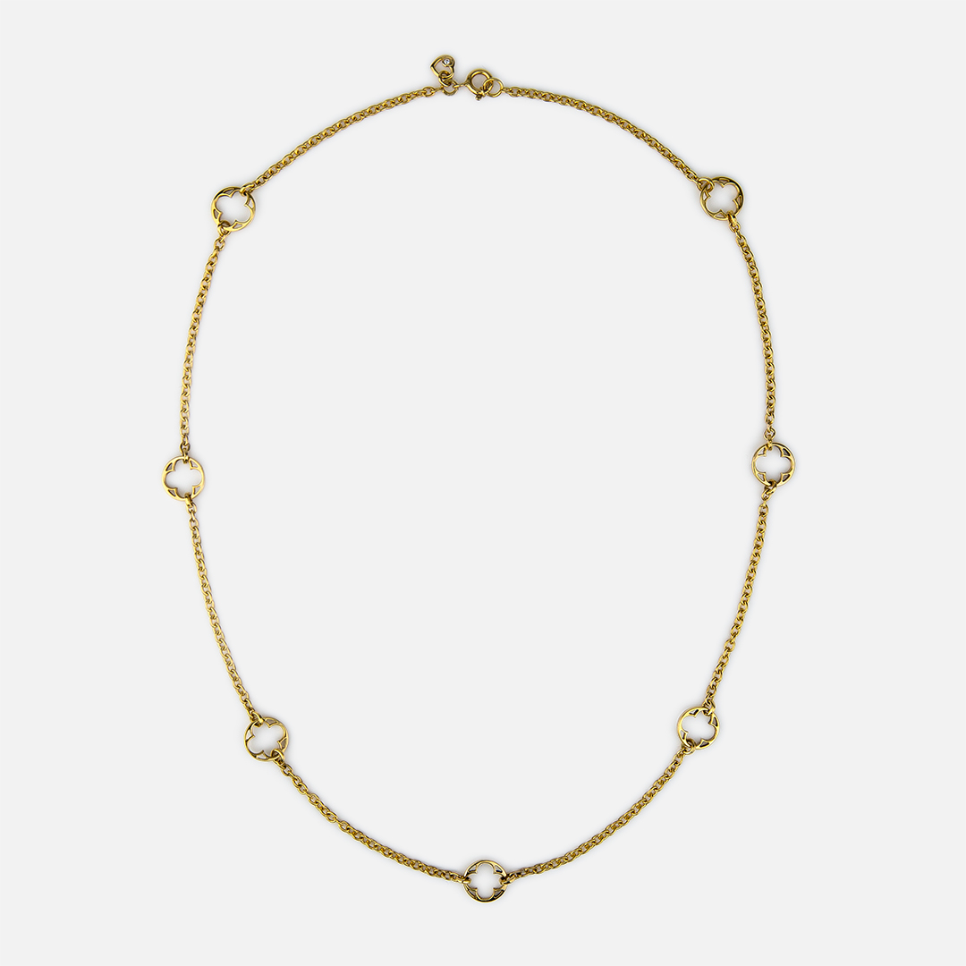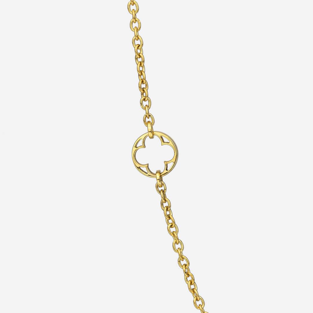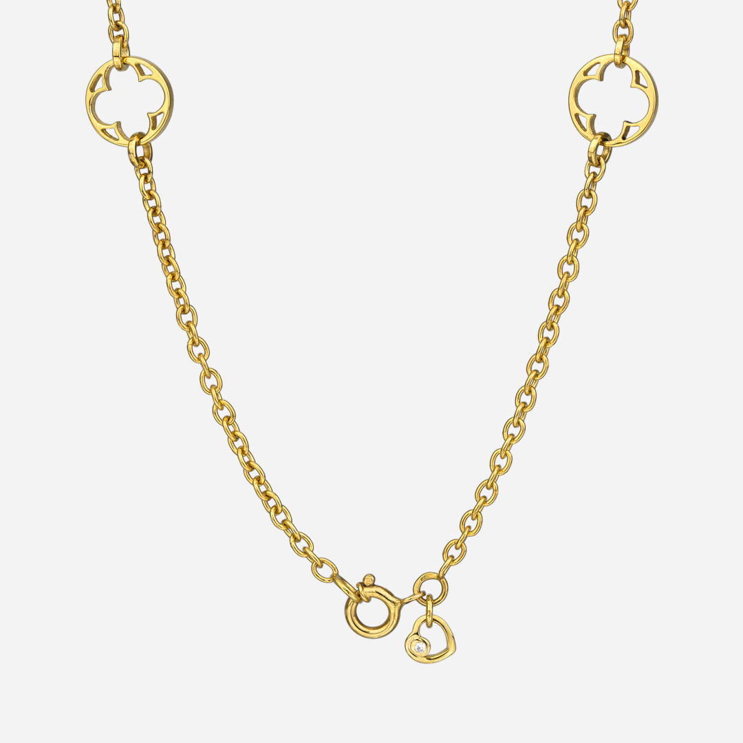 The carved stone that supports the stained glass windows of the Monastery of Batalha is the basis for the design of the Promessa de Amor collection. The gold necklace with elements from the collection's motif, carefully hand-cut in the Leitão & Irmão workshops. A unique piece for a young woman of classic and timeless elegance.