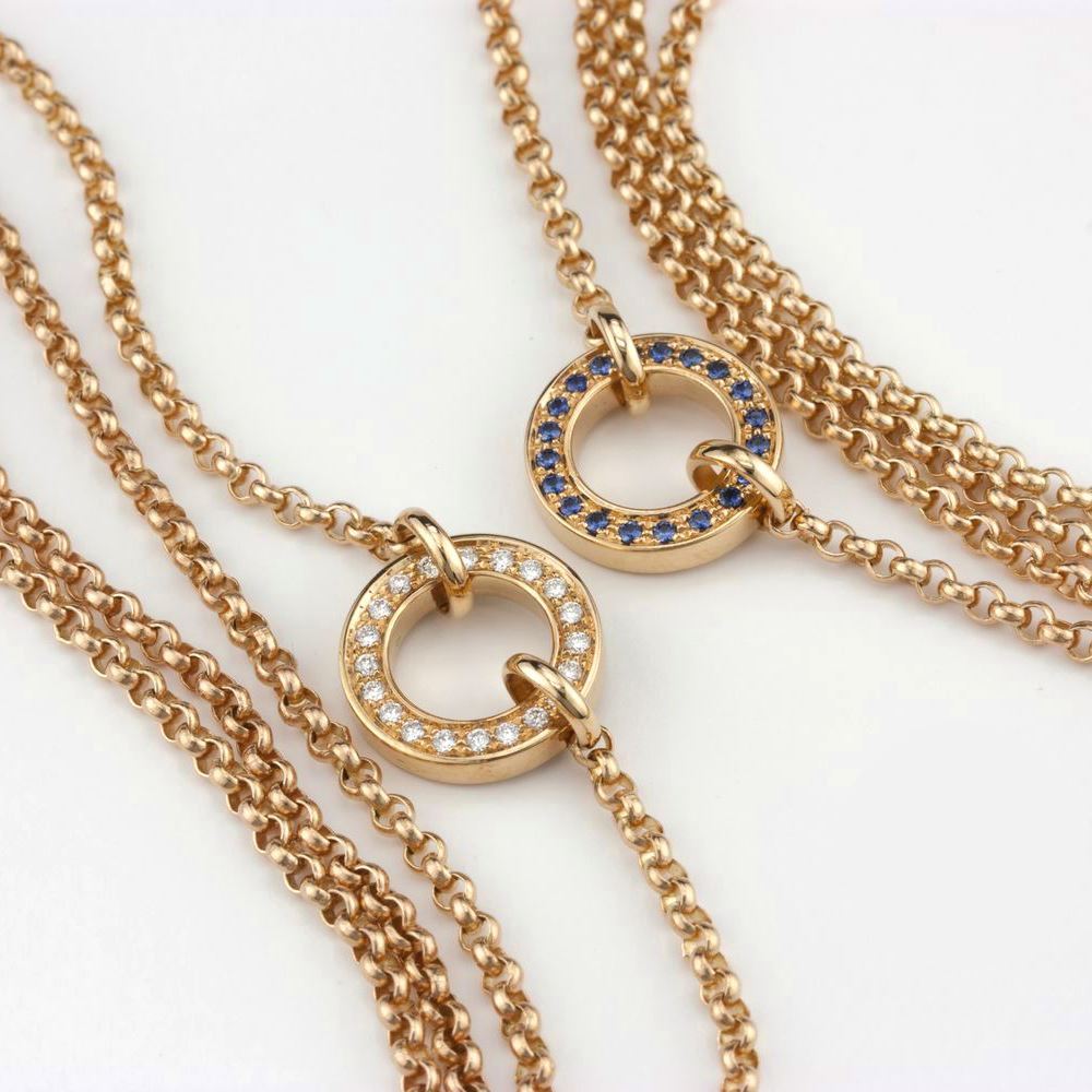 Yellow gold necklace, a modern jewel enriched with the sparkle of diamonds and blue sapphires, a tribute to the traditional Portuguese Cord, with the particularity that one side of the piece has blue sapphires and the other diamonds.