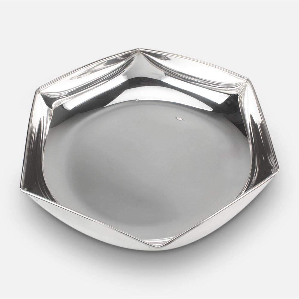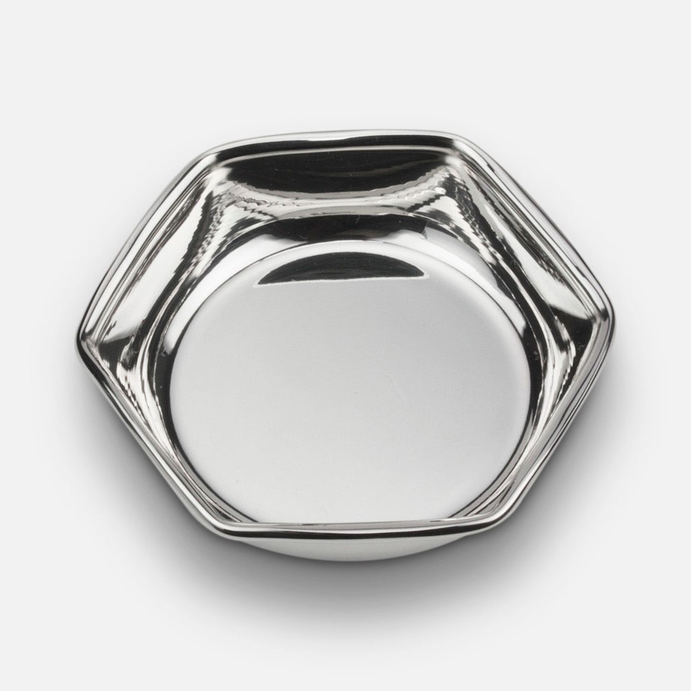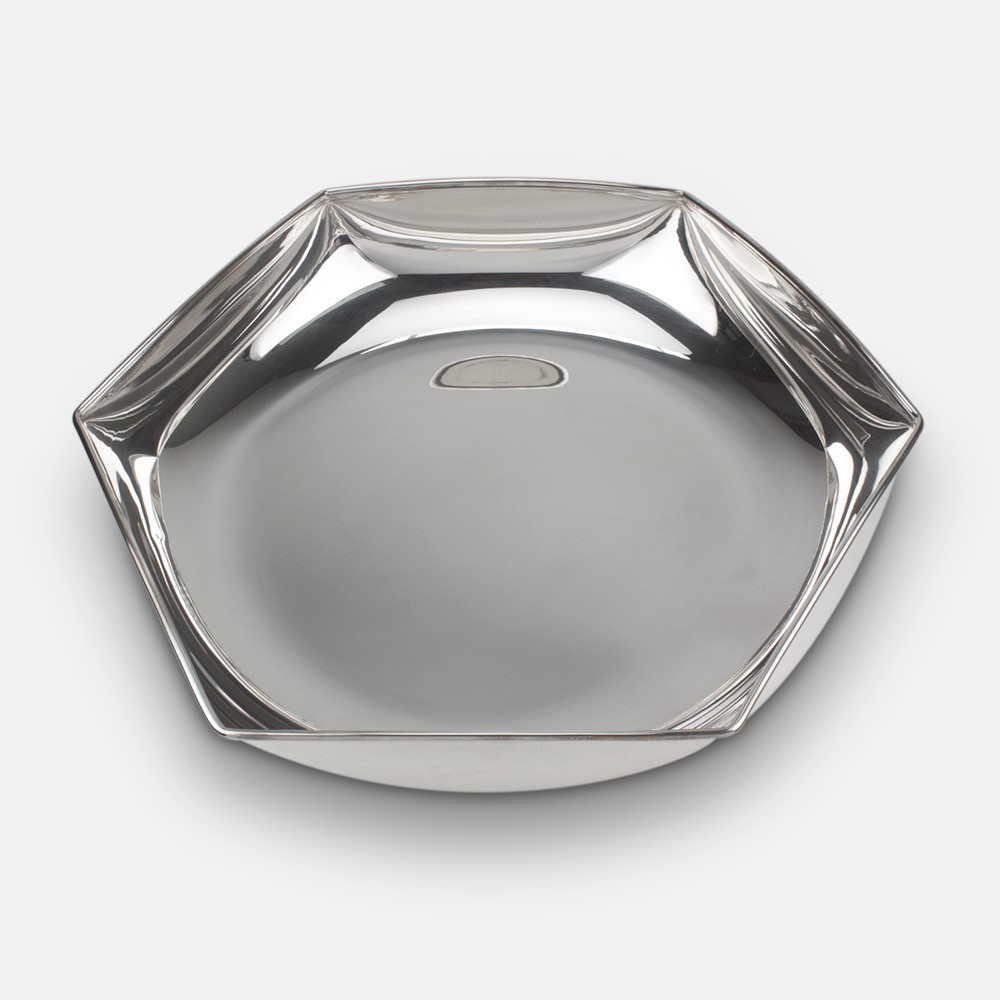 A silver piece manufactured in our centenary workshops, where a circular base salver is given a geometric shape through a long process of moulding, heating and cooling. The manual labour gives this piece a unique personality and identity.