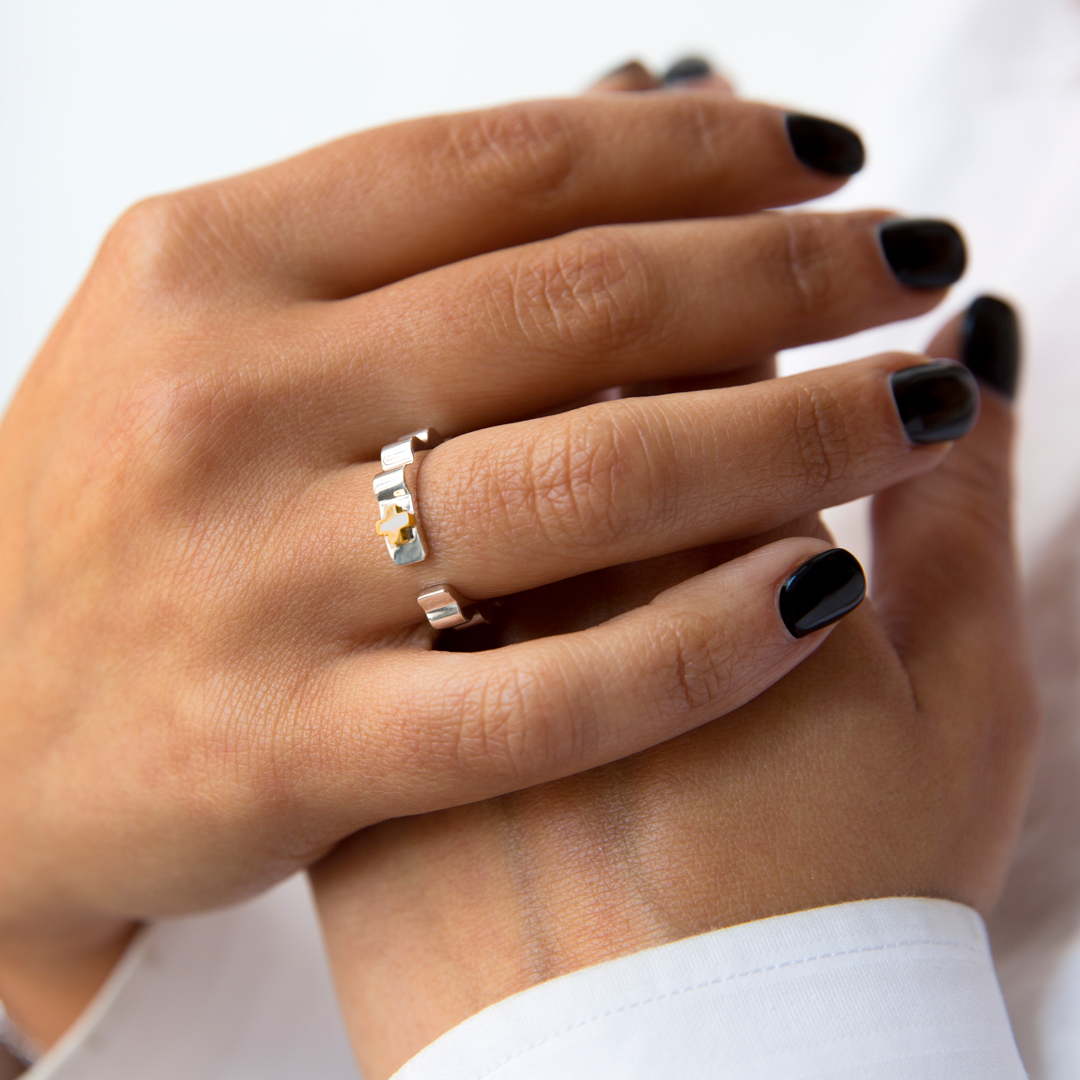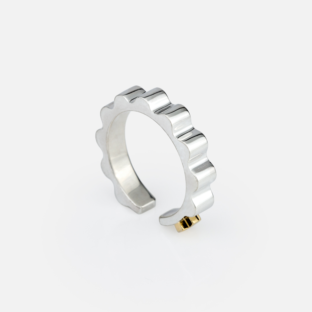 Um Anel onde as contas são substituídas por uma engrenagem que não evidencia o que representa, mas que nos move para o transcendente. Com um design simples e elegante, revela o valor da intimidade. Uma peça que acompanha a jornada da vida.