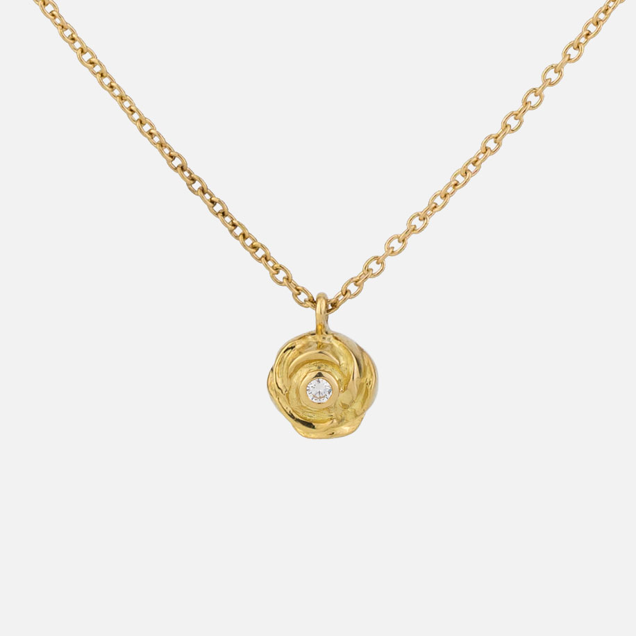 Neste fio de ouro, destaca-se o “charm” com a rosa também em ouro onde brilha, no centro, uma gota de orvalho representada por um diamante.