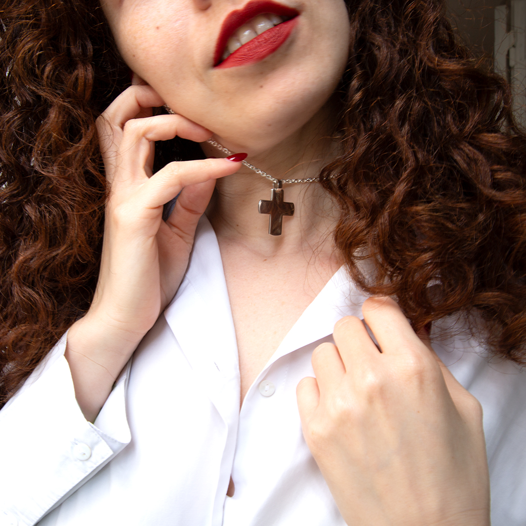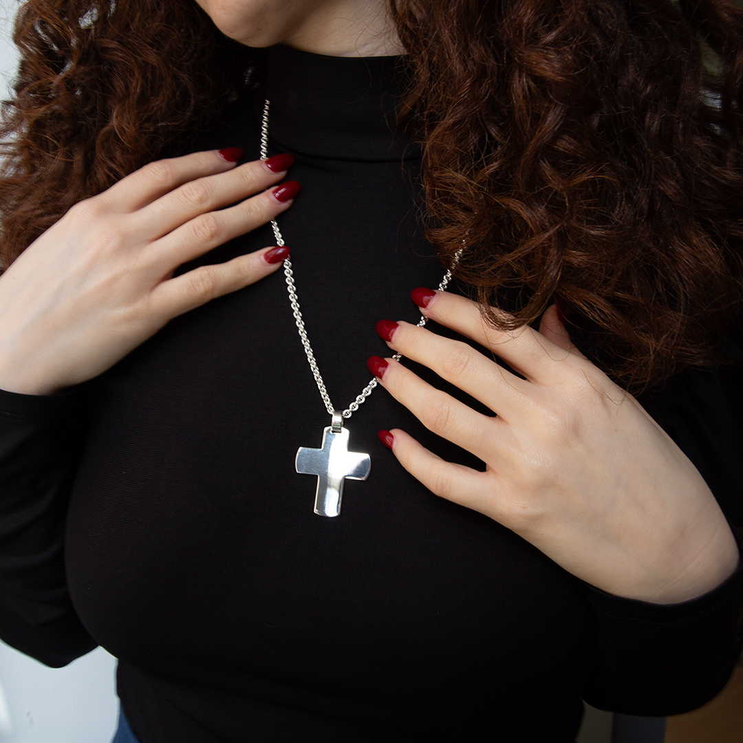 A Cruz em Prata Modelo Pontas em arco é uma peça que combina simplicidade com um toque de significado. Com o seu design delicado de pontas arredondadas, esta cruz é uma expressão elegante de fé e espiritualidade.
