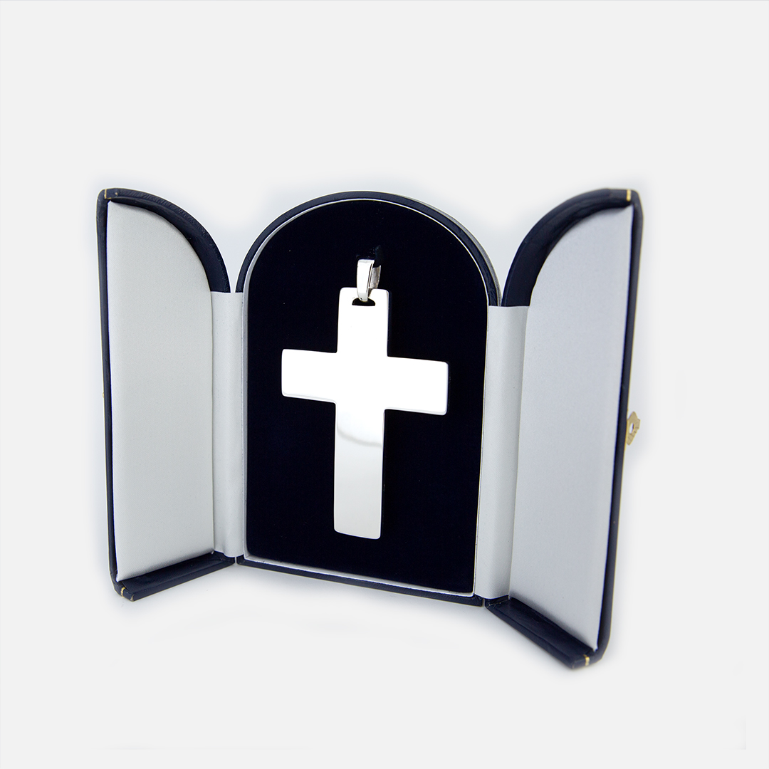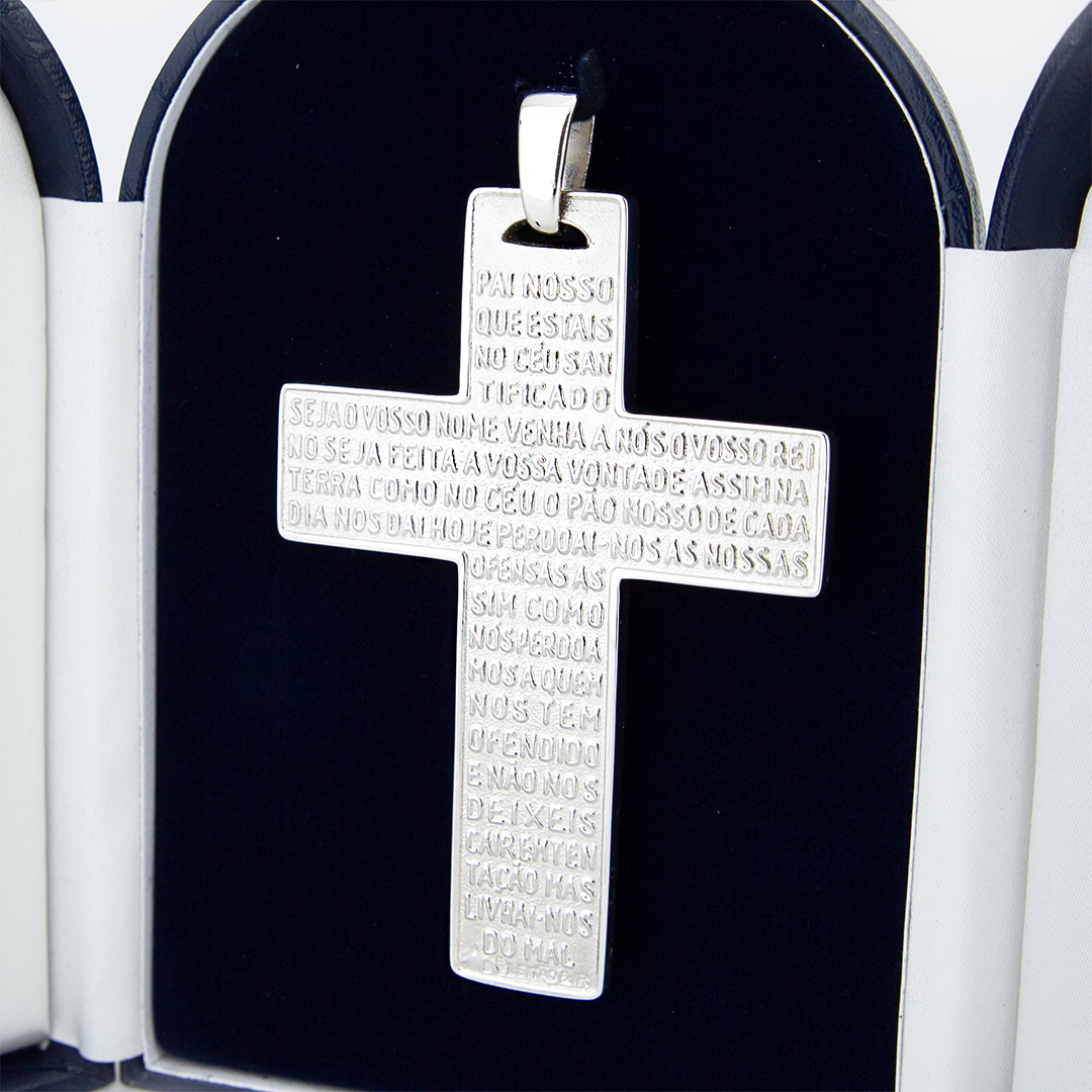 Descubra a cruz pai nosso em prata da Leitão & Irmão. Ideal para oferecer no nascimento de uma criança ou no batizado. A cruz é esculpida apenas num dos lados.