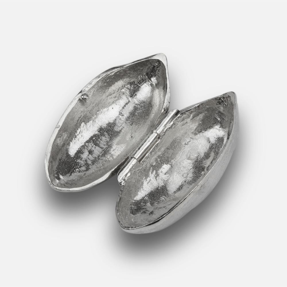 Caixinhas perfeitas para colecionar, para oferecer aos amantes da natureza, a quem tem tudo ou uma caixa para colocar os comprimidos. Os Frutos da Terra transformam em pequenas e preciosas caixinhas de prata os frutos que a terra nos dá, manufaturadas nas oficinas Leitão & Irmão. A nós americana é nutritiva, saborosa, uma dádiva da natureza. Agora em prata 925 esculpida à mão.