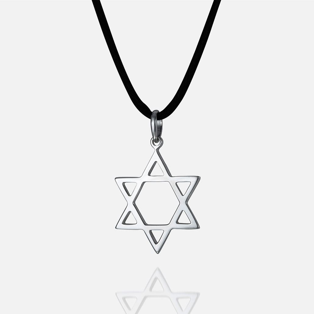 O design do Pendente Estrela de David em prata, manufaturado pela Leitão & Irmão, apresenta a forma icônica de duas sobreposições de triângulos equiláteros, criando a imagem da estrela de seis pontas. A prata lustrada conferiria à peça um brilho elegante e uma aparência sofisticada.