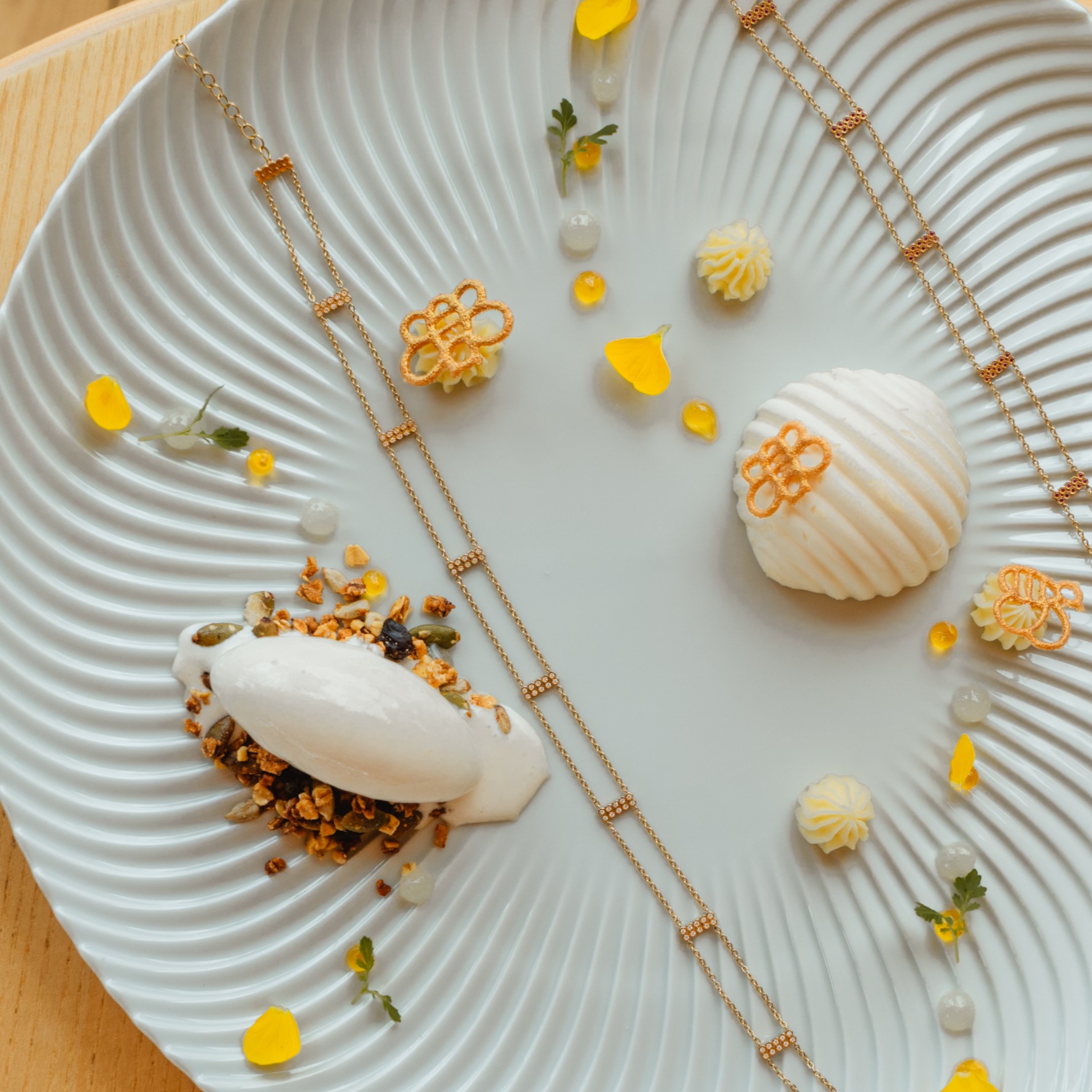 O pink honey choker é uma joia que celebra a beleza, elegância e o trabalho árduo das abelhas. Representando a sua importância no ecossistema, que com o seu espírito de viajantes percorrem grandes distâncias encontrando sempre o caminho de retorno. Mostrando que tal como as abelhas transformam o néctar em mel, podemos transformar os momentos simples da vida em algo extraordinário.