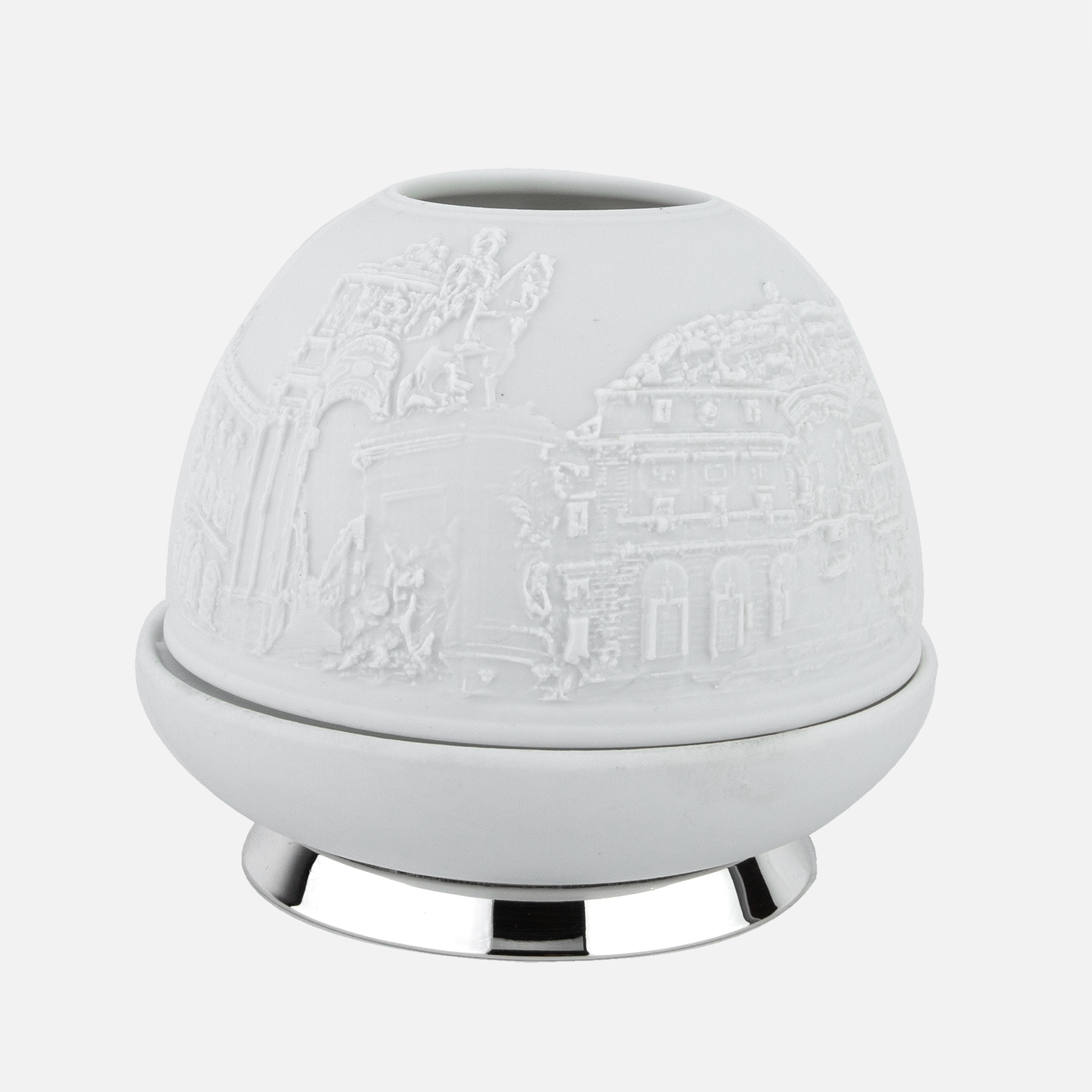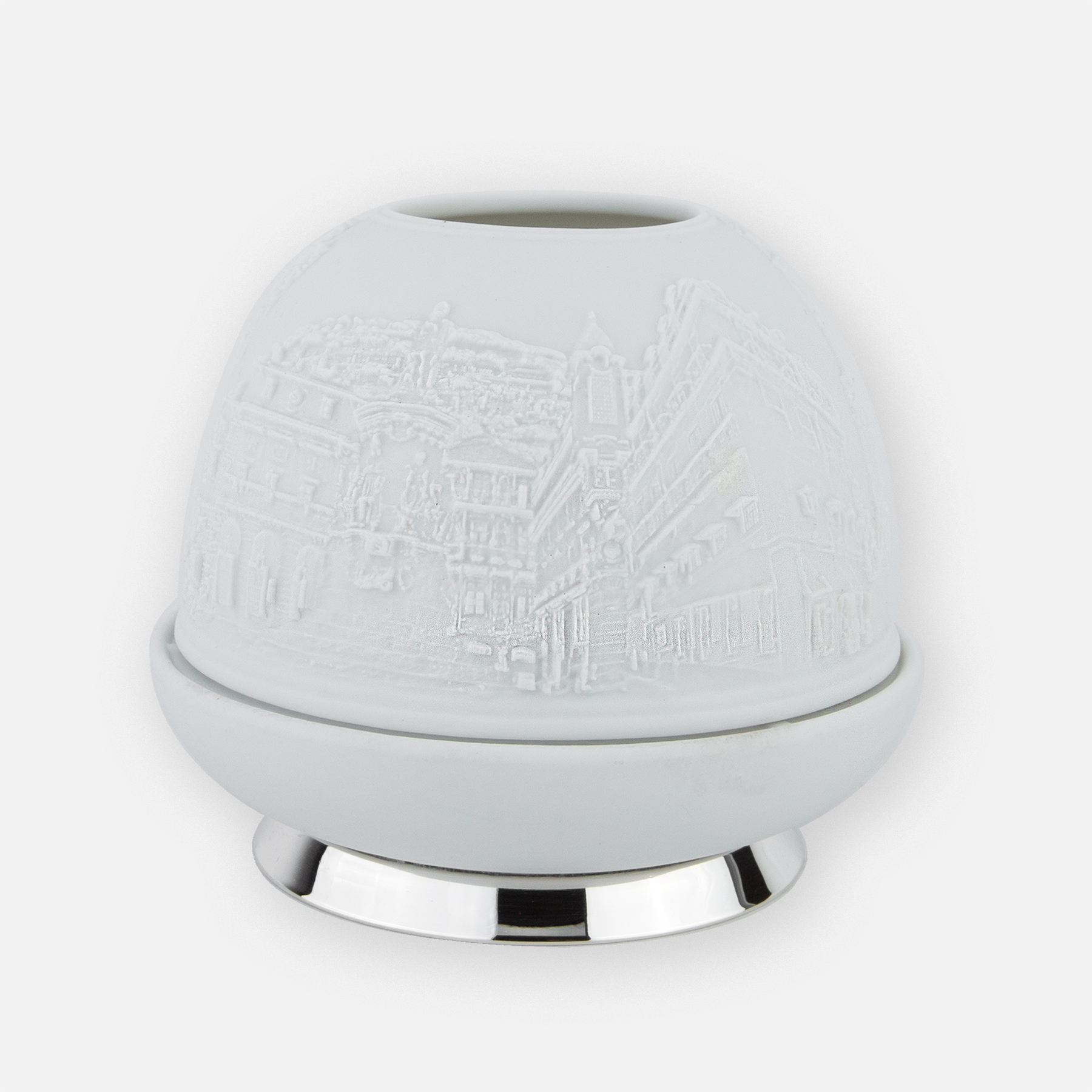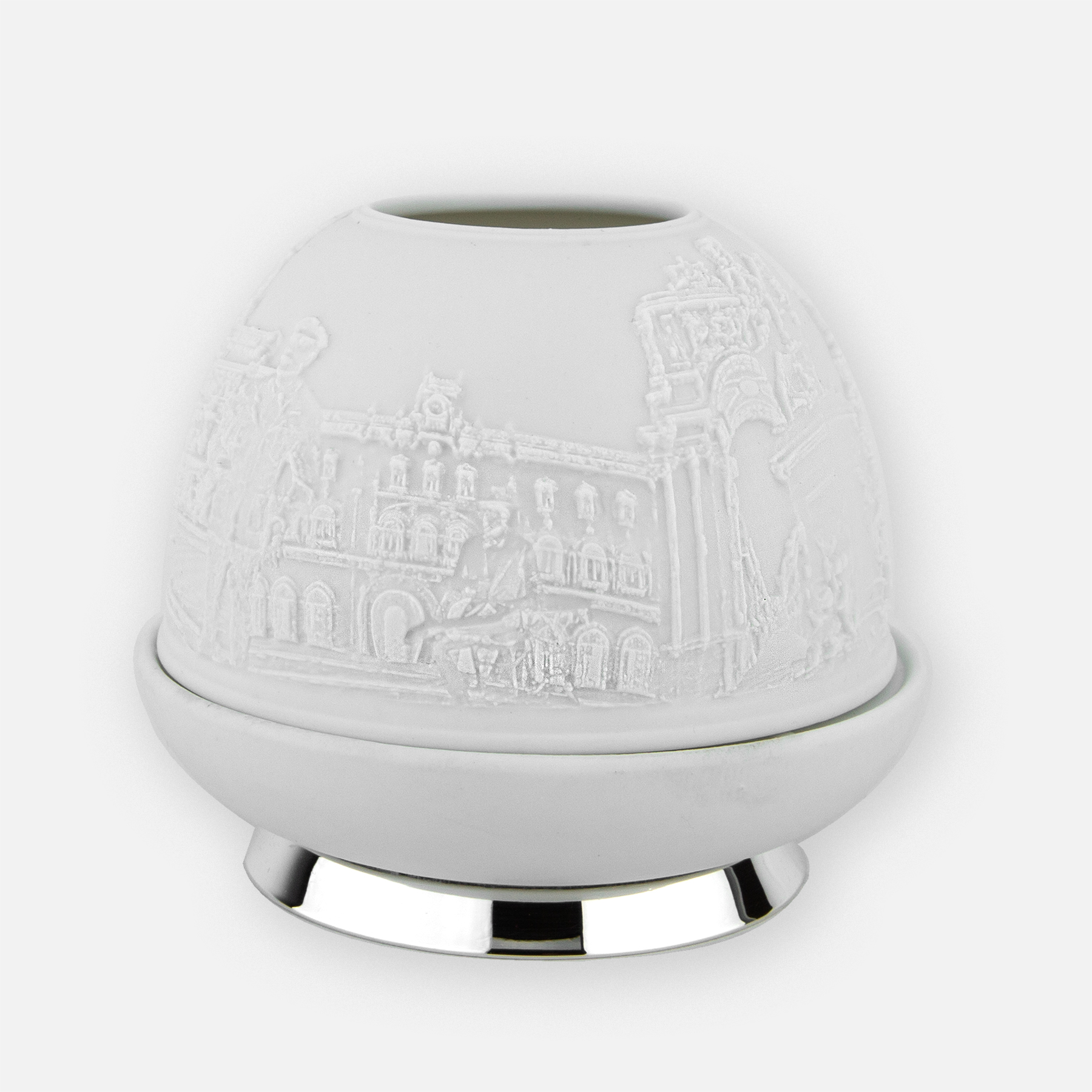 O Porta-Velas em Porcelana e Prata inspirado na Baixa – Chiado é uma peça que combina a delicadeza da porcelana com a sofisticação da prata. Acrescente um toque de elegância e luz suave ao seu espaço.